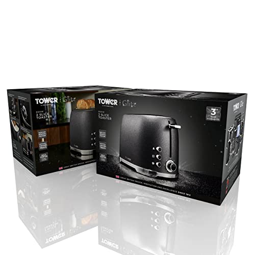 Tower Glitz T20029 2 Slice Metal Toaster with Adjustable Browning Control, Defrost and Reheat Settings, Black