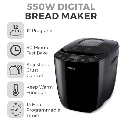 Tower T11003 2 lb Digital Bread Maker with 12 Automatic Programs, 13 Hours Delay Timer, 60 Minutes Keep Warm Function, Adjustable Crust Control, Non-Stick Bread Pan, 550 W, Black