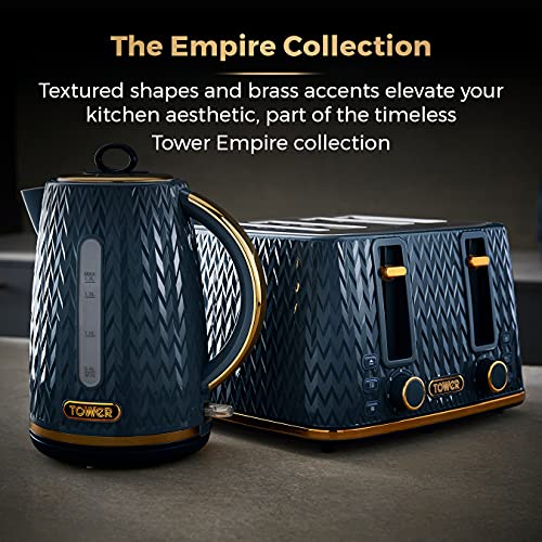 Tower T20061BLK Empire 4-Slice Toaster with Defrost/Reheat, Removable Crumb Trays, 1600W, Midnight and Brass & T10052MNB Empire 1.7 Litre Kettle with Rapid Boil, Removable Filter, 3000 W