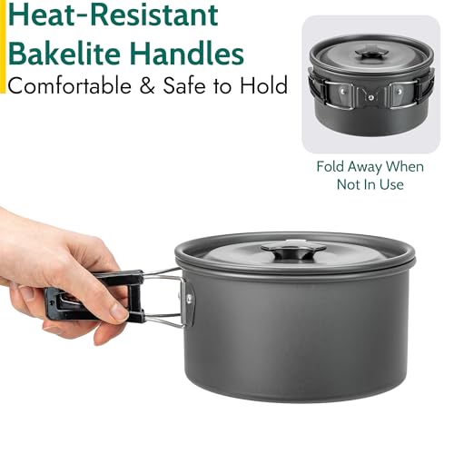 - HEAT-RESISTANT BAKELITE HANDLES: Cooking pot, frying pan, and kettle designed with durable, heat-resistant Bakelite handles. So, you can safely pick them up and handle them when you're cooking or pouring a brew. For easy, compact storage, the handles on the cooking pot and frying pan are foldable with a curved shape to wrap neatly back around them.