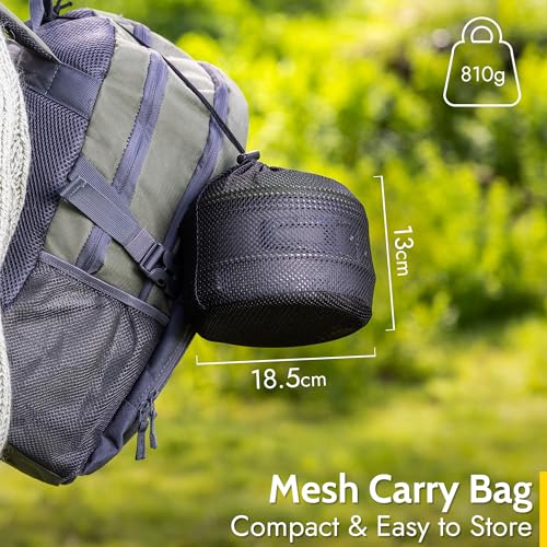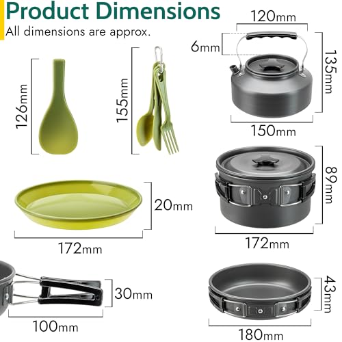 - STACKABLE WITH MESH CARRY BAG: Place the kettle, cups, and utensils inside the cooking pot, then pop the plates inside the pan. Stack everything together, then pop it inside the mesh bag included, which has a cord to keep everything secure. Compact and lightweight, the set measures 13cm x 18.5cm x 18.2cm and weighs 0.81kg when stored inside the bag.