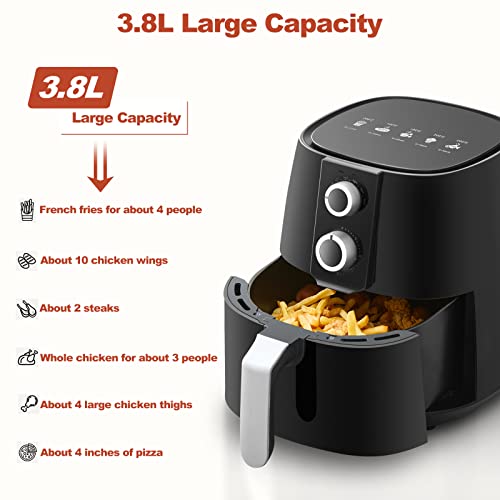 - 3.8L single basket large capacity: The 3.8L large capacity can provide you with 2-3 servings of cooking space, It can hold about 10 chicken wings, 2 steaks or 4 large chicken thighs, and at the same time the air fryer is compact in size, so don't worry it will take up too much space in your kitchen.