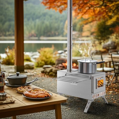 - Durable Stainless Steel Build – Tent stove made of high temperature resistant stainless steel, this tent stove wood burner is built to last; The chimney's spark-proof design prevents sparks from scattering, while the rainproof feature keeps rainwater out, ensuring safe and efficient burning in all weather conditions, perfect for camping, backpacking, ice fishing, and hunting trips