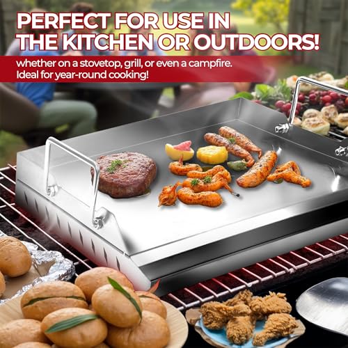Universal Griddle for Gas Grill, 18" Stainless Steel Griddle Pan, Nonstick Flat-Top Griddle with Grease Groove & Removable Handles – Ideal for Flat Grills and Outdoor Cooking