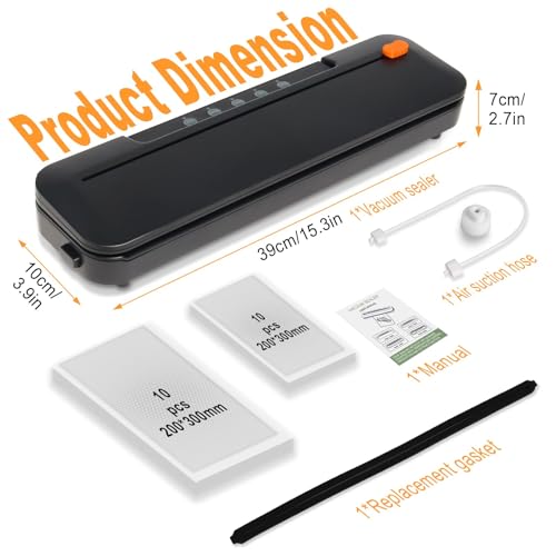 - 【Complete Starter Kit】: Includes 20 vacuum bags (10pcs: 20*30cm, 10pcs: 20*15cm), 1 vacuum hose, 1 connector, 1 replacement gasket, 1 User Manual, and 1 Vacuum Sealer. Start using your vacuum sealer right away with everything you need included, no need to purchase additional bags.