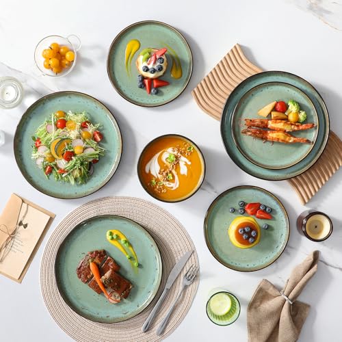 vancasso Amber 18 Pieces Dinner Set for 6, Reactive Glaze Stoneware Plates and Bowls Set, Green Crockery Set with Dinner Plates, Dessert Plates & Cereal Bowls, Microwave & Dishwasher Safe