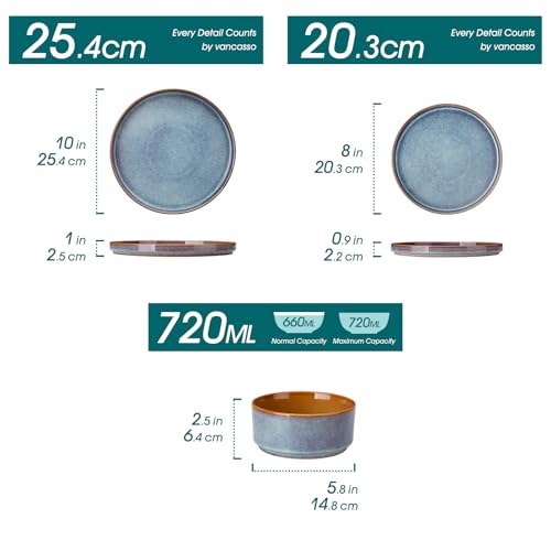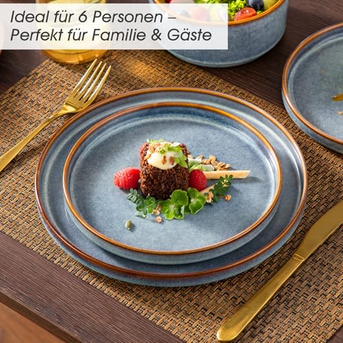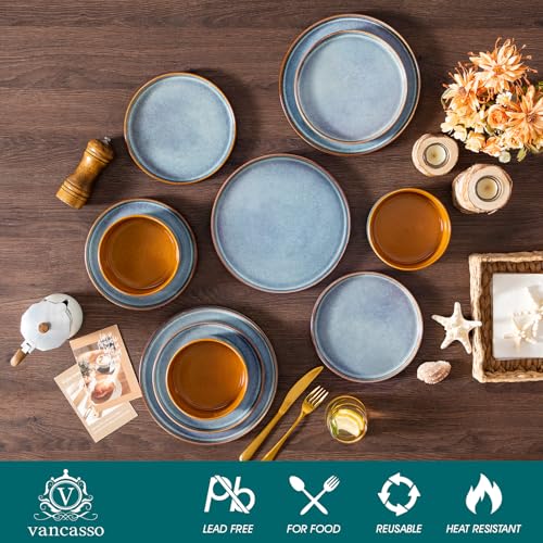 vancasso Onion Plates and Bowls Set, 18-Piece Mediterranean Style Stoneware Dinner Sets for 6 People, Reactive Glaze Crockery Set with Dinner Plates, Dessert Plate and Cereal Bowls, Blue Caramel