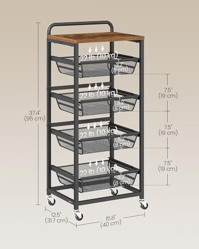 VASAGLE 5-Tier Storage Trolley with Pull-Out Baskets, Kitchen Shelf with Wheels, Handle, 31.7 x 40 x 95 cm, Rustic Brown and Ink Black LRC041K01