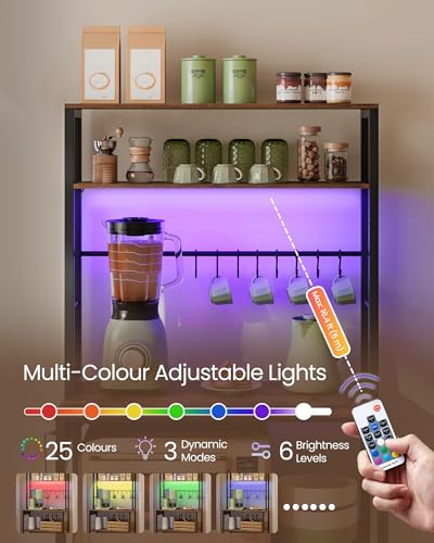 VASAGLE Coffee Bar with LED Lights, Kitchen Bakers Rack with Power Outlet, Microwave Stand with Adjustable Shelves, 8 Hooks, 40 x 80 x 168.4 cm, Rustic Brown and Matte Black KKS050KD02