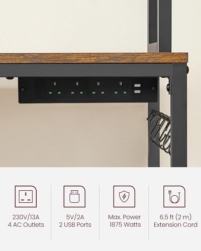 VASAGLE Kitchen Storage Rack with Power Outlet, Coffee Bar, Baker's Rack, with Metal Wire Panel, 14 Hooks, for Microwave, Steel Frame, 40 x 60 x 170 cm, Rustic Brown and Ink Black KKS037B21