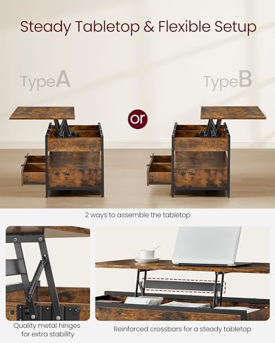 VASAGLE Lift Top Coffee Table, Living Room Table, with Storage Drawers, Hidden Compartments, and Open Shelf, Rustic Brown and Ink Black LCT209K01