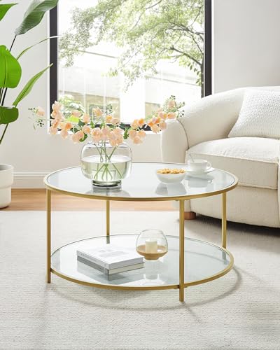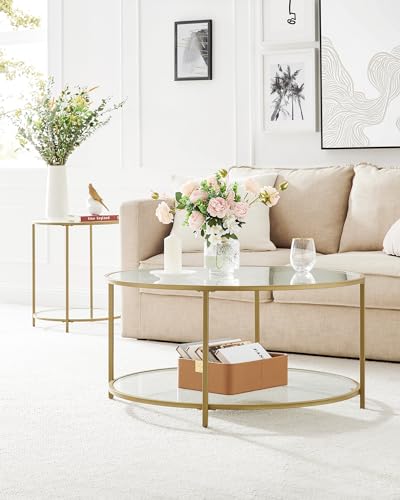 VASAGLE Round Side Table, Small Coffee Table, 2-Tier Tempered Glass End Table with Steel Frame, Bedside Table, with Open Storage Shelf, Modern Style, for Living Room, Bedroom, Gold LGT035A61