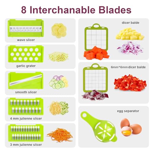 - 【Product Composition】the chopper comes with 7 interchangeable blades,Looking for a potato slicer, tomato slicer, onion cutter, cheese slicer and more?This vegetable cutter includes a fine and medium dicer, a grater, a coarse shredder, a julienne blade, and a slicer blade and a garlic grinderall.