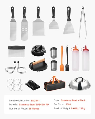 VEVOR 28PCS Griddle Accessories Kit, Flat Top Grill Accessory, Enlarged Spatula Gift Set, Stainless Steel Grilling Tools with Basting Cover, Tong, Burger Press, Carry Bag, for Outdoor BBQ Teppanyaki