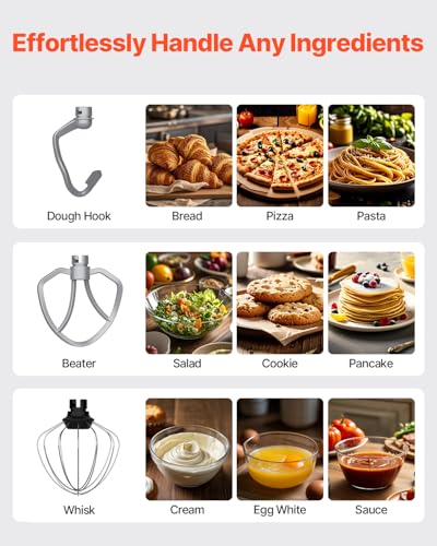 - Complete Mixing Solution: Ready to tackle anything in the kitchen! Our stand mixer features 3 professional mixing attachments: a dough hook for effortlessly kneading pizza or other heavy dough, a flat beater for whipping up mashed potatoes, cake batters, or frosting, and a whisk for creating light mixtures like fluffy whipped cream or egg whites.