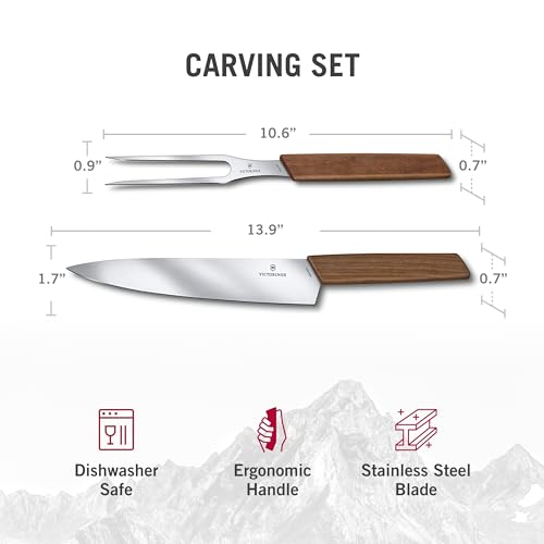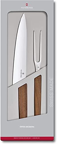 - SWISS MODERN CARVING SET, 2 PIECES – Set with Carving Fork and Carving Knife. The perfect set for carving meat no matter the size. With stainless, wear-resistant steel blade and walnut wood handle