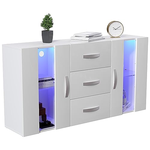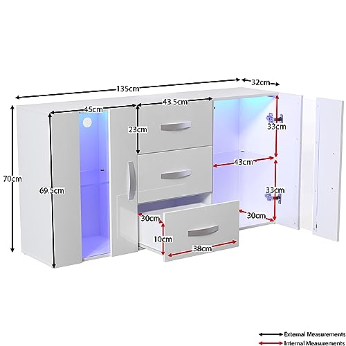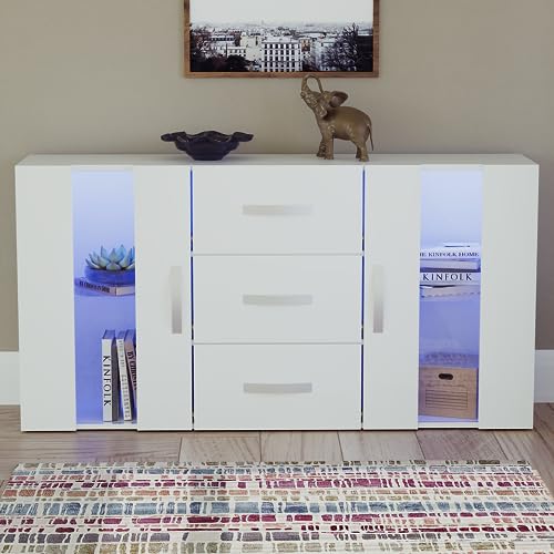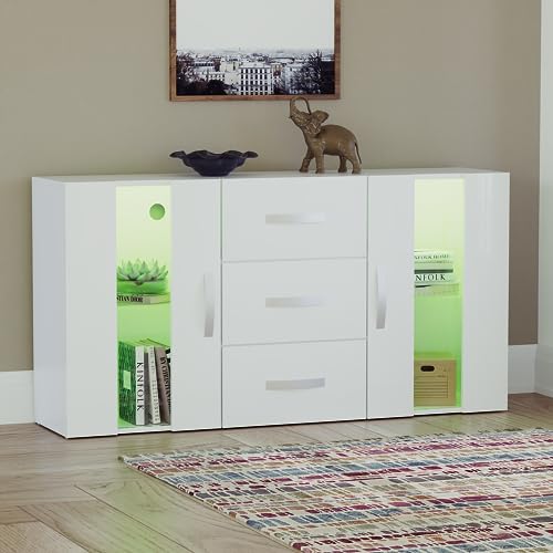 Vida Designs Astro 2 Door 3 Drawer Modern LED Sideboard in White, RGB Lights (Fade/Strobe Options Included), Wooden Matte Style with High Gloss Features