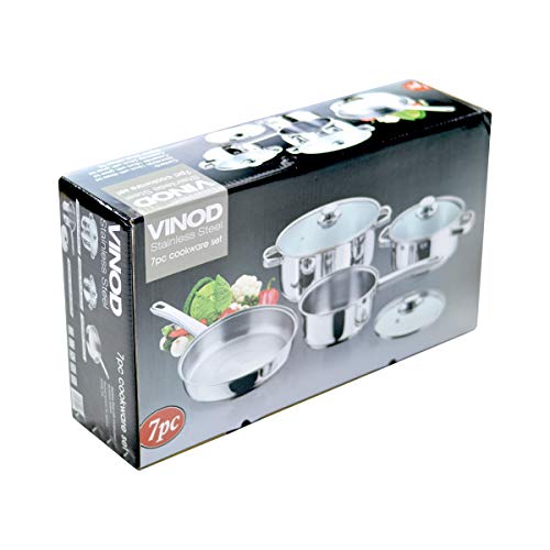 Vinod 7pc Stainless Steel Cookware Set (Frypan/Sauce Pan 2 Cooking Pots w/Glass Lid), Medium, Silver
