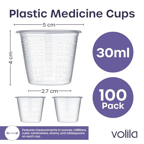 volila Medicine Cups – 100 Pack 30ml Disposable Small Plastic Medicine Measuring Cups – Translucent Medicine Cup for Liquid Medication, Measuring Ingredients in Cooking, Arts and Crafts