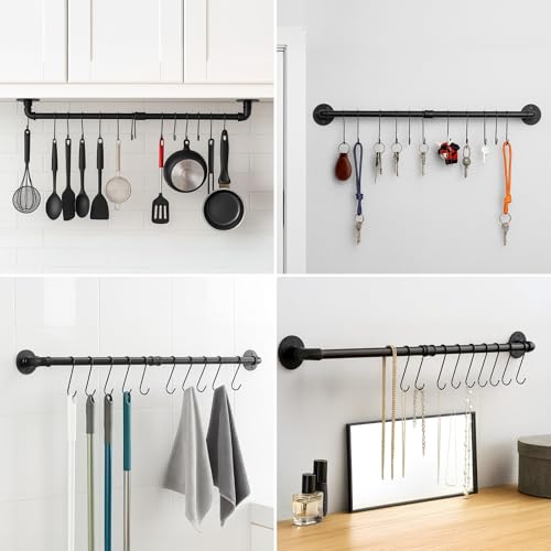 - [Sturdy and Durable Metal Construction] This pot rack is made of high-quality metal with a matte black powder coat finish, making it durable, warp-resistant, and corrosion- and rust-resistant. It has a load capacity of up to 35 kg. Sometimes simple is best, and this simple wall-mounted pot rack is perfect for that. You can use it as a kitchen utensil rack. Remove all the hooks and it becomes a beautiful towel rack or bathroom hook.