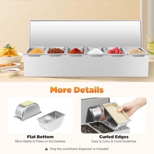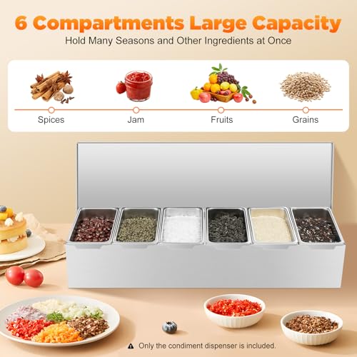 - 【Large Capacity】This stainless steel condiment dispenser contains 6 separate compartments with a deepening design (7cm/2.8in). It can hold many seasons and other ingredients at once, making it easy to handle busy kitchens and a large number of catering services