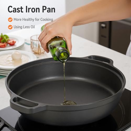 - 🥓 𝐍𝐨𝐧-𝐒𝐭𝐢𝐜𝐤 𝐅𝐥𝐚𝐭 𝐒𝐮𝐫𝐟𝐚𝐜𝐞 𝐚𝐧𝐝 𝐈𝐧𝐜𝐥𝐮𝐝𝐞𝐝 𝐆𝐥𝐚𝐬𝐬 𝐋𝐢𝐝 – this versatile cast iron grill pan works seamlessly across gas, induction, and electric stovetops while being oven-safe (though not microwave compatible). Perfect for everything from searing steaks and frying eggs to baking pancakes and slow stewing, its premium non-toxic coating promotes healthier cooking by requiring minimal oil. The tempered glass lid allows for easy monitoring and moisture retention