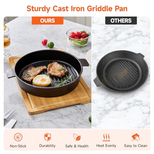 Warmiehomy Cast Iron Griddle Pan,27cm Pre-Seasoned Non-Stick Grill Pan,Round BBQ Cast Iron Skillet with 2 Handles for Gas Induction Electric Hobs and Oven Safe,Ridge Surface