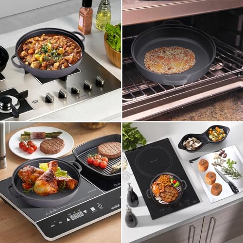 - 【Flat Surface and Non-Stick】The cast iron grill pan can be used on gas induction electric hob and oven,but no microwave.This non-stick flat surface cast iron skillet is good at baking or frying pancake,steak,eggs.Also it is suitable to stew.