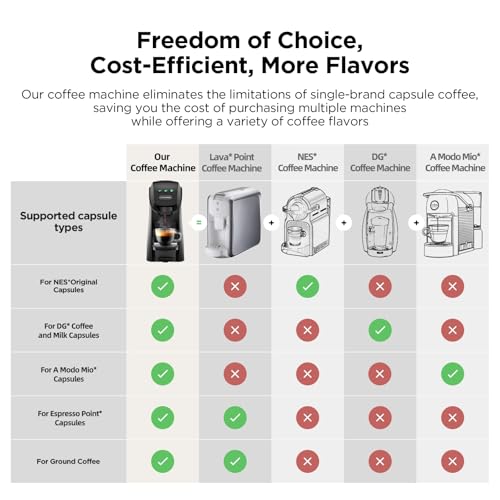 - 5 in 1 COMPATIBILITY: The Warriors1 adaptable pod coffee machine is compatible with Nespresso Original Line (OL), Dolce Gusto coffee pods, Lavazza A Modo Mio, FAP Espresso Point capsules (includes reusable point pod), and ground coffee. It caters to your family’s or office’s varied coffee recipes, providing over 100 coffee shop-style drink options. From Espresso to Cappuccino and hot chocolate, relish all your preferred breakfast and afternoon coffees in one machine, eliminating the need for multiple coffee makers.