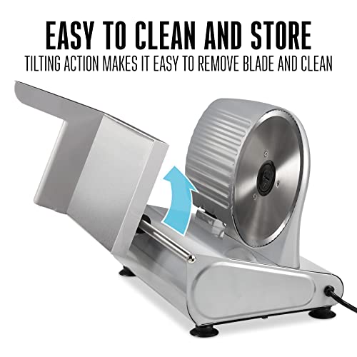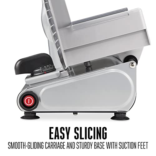 - EASY SLICING WITH MINIMAL EFFORT: The smooth-gliding carriage with durable stainless steel food tray makes slicing meats and other foods easy. Suction feet help to hold the sturdy base in place while slicing.