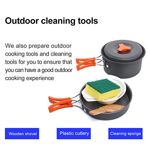 - 【COOKING SETS INCLUDE】: 1*1.6L soup pot, 1*1.1L kettle, 1*frying pan, 2*bowl, 1*spatula, 1*cleaning sponge, 1 x travel bag.Suitable for 2~3 people.This camp cookware set is a good choice for group /Couples camping or any other activity.