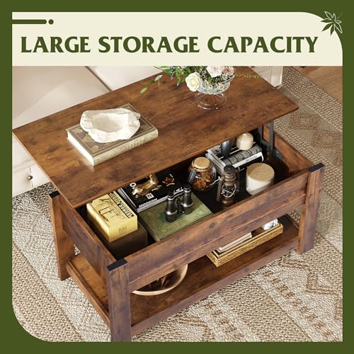 WLIVE Lift Top Coffee Table, 98CM Lift Up Coffee Table with Hidden Compartment, Wooden Coffee Table with Storage Shelf for Living Room, Rustic Brown