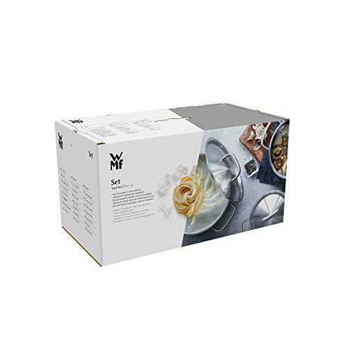 - Content: 2x Stewing pan with lid 16 cm (approx. 1.4l), 20 cm (approx. 2.5l), 2x meat pot with lid 16 cm (approx. 1.9l), 20 cm (approx. 3.3l), 1x pan without lid 16 cm (approx. 1.5l)