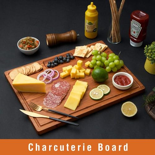 - LARGE SIZE FOR ALL NEEDS:The bamboo chopping board set for kitchens measures 15.7x11x0.6'', cutting board wood could be used as cutting, chopping, carving board, cheese board, heavy duty butcher block or serving tray, Bread boards wooden