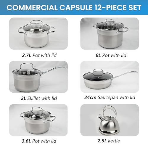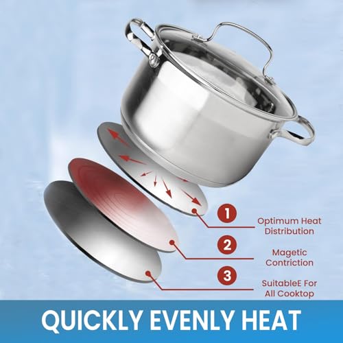 - 【 Whole Clad & HIGH QUALITY 18/10 STAINLESS STEEL】Crafted with premium stainless steel construction, these pots and pans ensure rapid, uniform heat distribution and excellent heat retention. The 18/10-grade stainless steel resists rust, withstands heavy use without warping, and maintains durability over time.