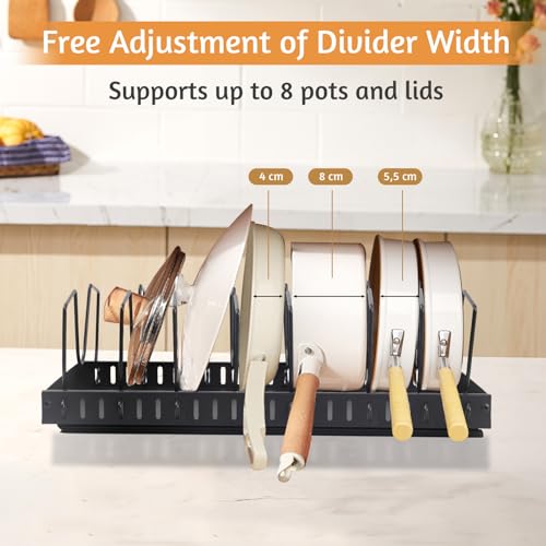 - 🍳【Adjustable Dividers】Pan Rack Holder with 8 customizable dividers, this pots and pans organizer under cabinet can be tailored to fit various cookware sizes, including flat pans, deep pots, lids, plates, saucepan and baking supplies, you can flexibly adjust the shelves spacing according to the actual size of the pots and pans, making organization simple and versatile.