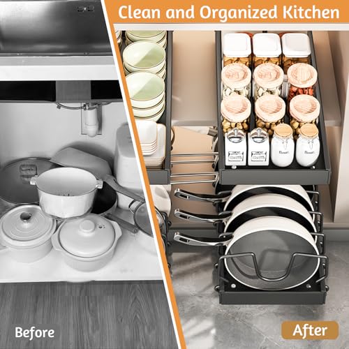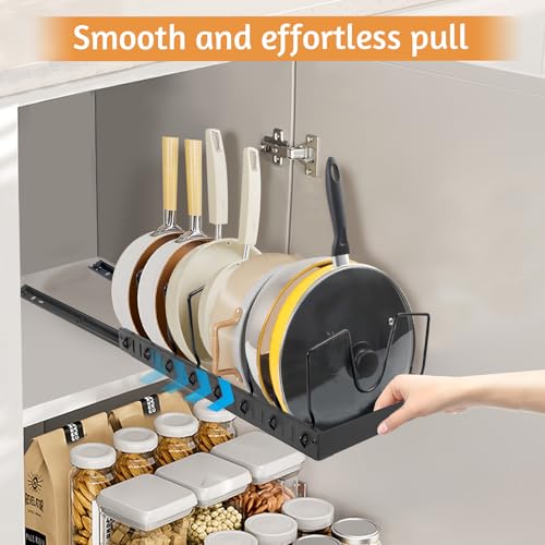 - 🍳【Smooth Glide】Our pull out drawers for cabinets equipped with 2 high-quality smooth sliding rails, which provides effortless, near-silent access to pots, pans, lids and other items, eliminating the need for bending and straining.