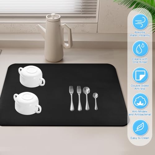 XRPRPX Dish Drying Mat, 16×24'' Draining Board Mat Kitchen Super Absorbent Draining Mats Quick Dry Coffee Machine Mats Non-Slip Dish Drainer Pad for Kitchen Counter-top Tabletop, Black