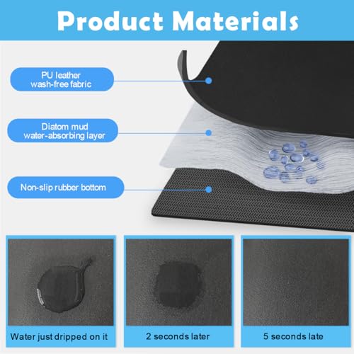 - 【Instantly Absorb Water, Keep Dry】The surface of our drain mat is made of nappa leather, and the middle is a layer of water-absorbing diatom mud. The density is about 0.6 times that of water, and the water absorption rate is about 2 times its own weight. 3 seconds to absorb water instantly, making the countertop dry constantly, thus inhibiting the growth of mold and keeping the countertops of your home or office always clean and tidy