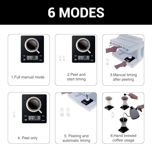 - Versatile Measurement Modes: Featuring 6 practical modes, this scale allows you to choose from full manual, manual timer, automatic timer, no timer, espresso, and pour-over settings. The integrated timer and tare function ensure precise control for both brewing and culinary tasks