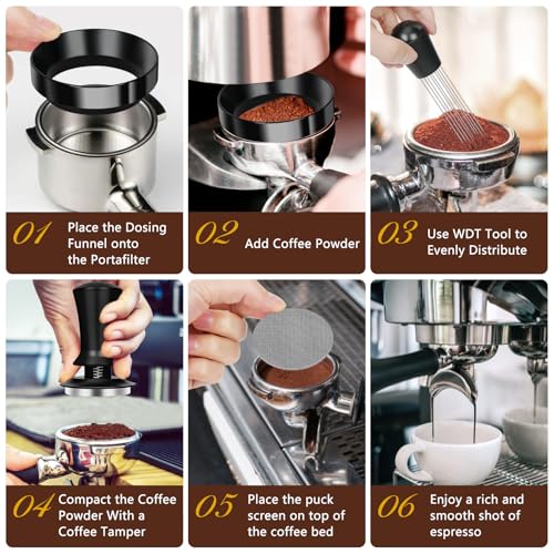 - 【Espresso Dosing Funnel Ring】With 4 magnetic wide mouth coffee dosing funnel that can be fixed to the outer ring of the filter basket without taking up space inside the basket, can increase the contact area and height of the coffee powder, so that the coffee powder falls into the bowl steadily during the collection process, effectively preventing flying powder, preventing waste of coffee powder and dirtying the coffee bar, reducing the mess of making coffee table.