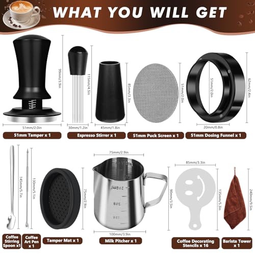 - 【25 Pcs Espresso Tamper Set】- A set of professional barista espresso tools: 1 x 51mm tamper, 1 x 350ml milk jug, 1 x coffee stirrer, 16 x decorative stencils, 1 x dosing funnel ring, 1 x puck screen, 1 x tamper mat, 1 x latte art pen, 1 x stirring spoon and 1 x barista towel. ( The 51 mm tamper fits for 51 mm or larger portafilter. Please measure the dia. of your portafilter before order.)