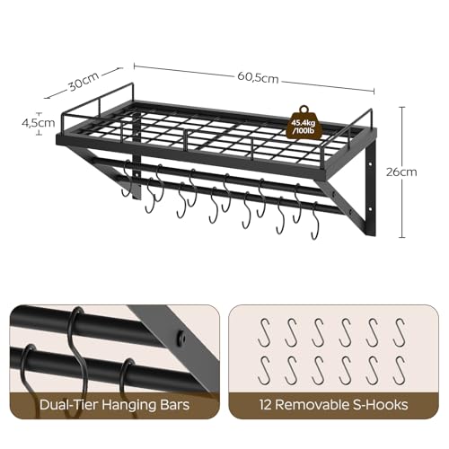 YATINEY Wall Mount Pot Pan Rack, Saucepan Storage, 2-Tier Kitchen Shelves Wall Mounted with 12 S-Hooks, Heavy Duty Metal Grid for Wall Storage, Space Saving for Kitchen, Bathroom, Black XPR01BK