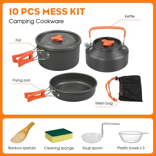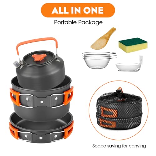 - 【Best Camping Cookware Kit】 The Camping Cookware Mess Kit is the ultimate solution for outdoor cooking. It includes a 1.1L kettle, a 2L pot with a lid, a 0.7L fry pan, 3 bowls, a soup spoon, a spatula, a cleaning sponge, and a carry bag. All items are conveniently stored in a mesh bag with a drawstring closure.