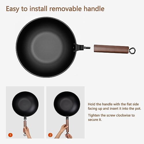 - 🍳 𝑪𝒐𝒎𝒇𝒐𝒓𝒕𝒂𝒃𝒍𝒆 𝑯𝒂𝒏𝒅𝒍𝒆 𝒂𝒏𝒅 𝑭𝒍𝒂𝒕 𝑩𝒐𝒕𝒕𝒐𝒎 𝑫𝒆𝒔𝒊𝒈𝒏: The nonstick wok use solid wooden handle to prevent scalding, which provides safe stir-fry and comfortable grip at high temperatures. The handle can be detached or hung for storage to save space. The wok pan is designed with a flat bottom to make sure that it sits securely on any stovetop, like induction cooktops, gas stoves, electric stoves, and other heat sources. Cooking is easier, faster, and more efficient with this wok.