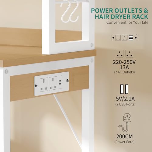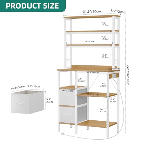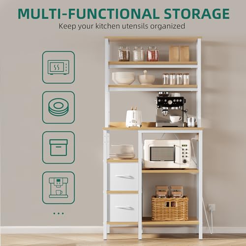 YITAHOME Kitchen Storage Rack with Power Outlet, 2 AC outlets 2 USB ports, Coffee Bar, Baker's Rack with 2 Drawers and 4 Hooks, microwave shelf, for oven, 31.5 x 15.7 x 66 inch, Oak and White