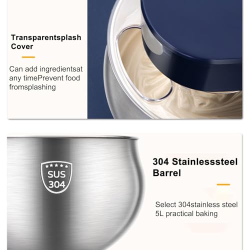 • 【Large Capacity for Party-sized Creations】The 5-liter stainless steel bowl provides ample space to mix large batches of delicious food. From cakes and cookies to salads and bread, this mixer can accommodate all your culinary creations. Whether you're hosting a dinner party or preparing family meals, our Stand Mixer makes it easy to impress your guests with mouthwatering dishes