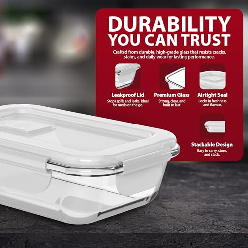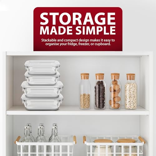 - STACKABLE & SPACE-SAVING STORAGE SOLUTION – These glass containers with lids are designed to neatly stack, saving space in cupboards, lunch bags, or fridges, helping you stay organised at home or on the go.