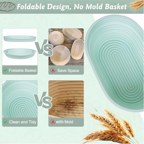 ZgoEC Sourdough Starter Kit Silicone Bread Basket – Foldable Banneton Proofing Basket Oval 10 Inch & Round 9 Inch – Proofing Accessories with Baking Mats & Storage Bag – Baker's Gift (Green)