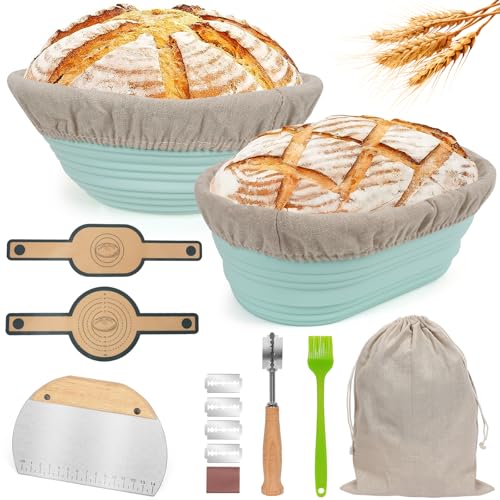 - Silicone Proofer Basket Set: The set includes a 9-inch round banneton proofing basket and a 10-inch oval bread proofing basket (made of silicone and collapsible), bread baking accessories including 2 linen cloths, 2 silicone bread baking mats, 1 Stainless steel dough scraper, 1 dough Bread Lame (with 1 blade guard, 5 blades), 1 silicone oil brush and a storage bag. Each accessory has its function, we also provide a description of what each accessory does, also a great sourdough set for newbies.